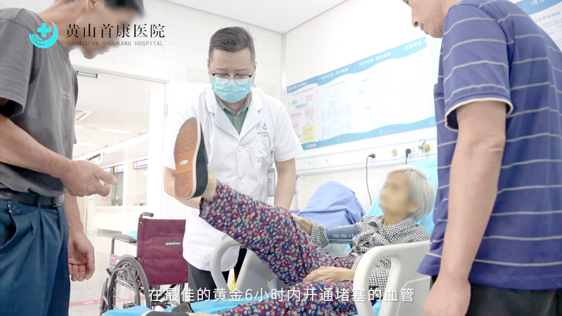 黄山首康医院副主任沈志龙带领的卒中团队立即为李奶奶启动卒中绿色通道。在医护们的全程陪同下,11点12分,完成头颅CT检查,排除脑出血,确诊为缺血性脑卒中。由于家属送医及时,李奶奶尚在溶栓时间窗内。11点25分,在排查了溶栓禁忌症,并征得家属同意后,医生为李奶奶急诊行阿替普酶溶栓治疗。
